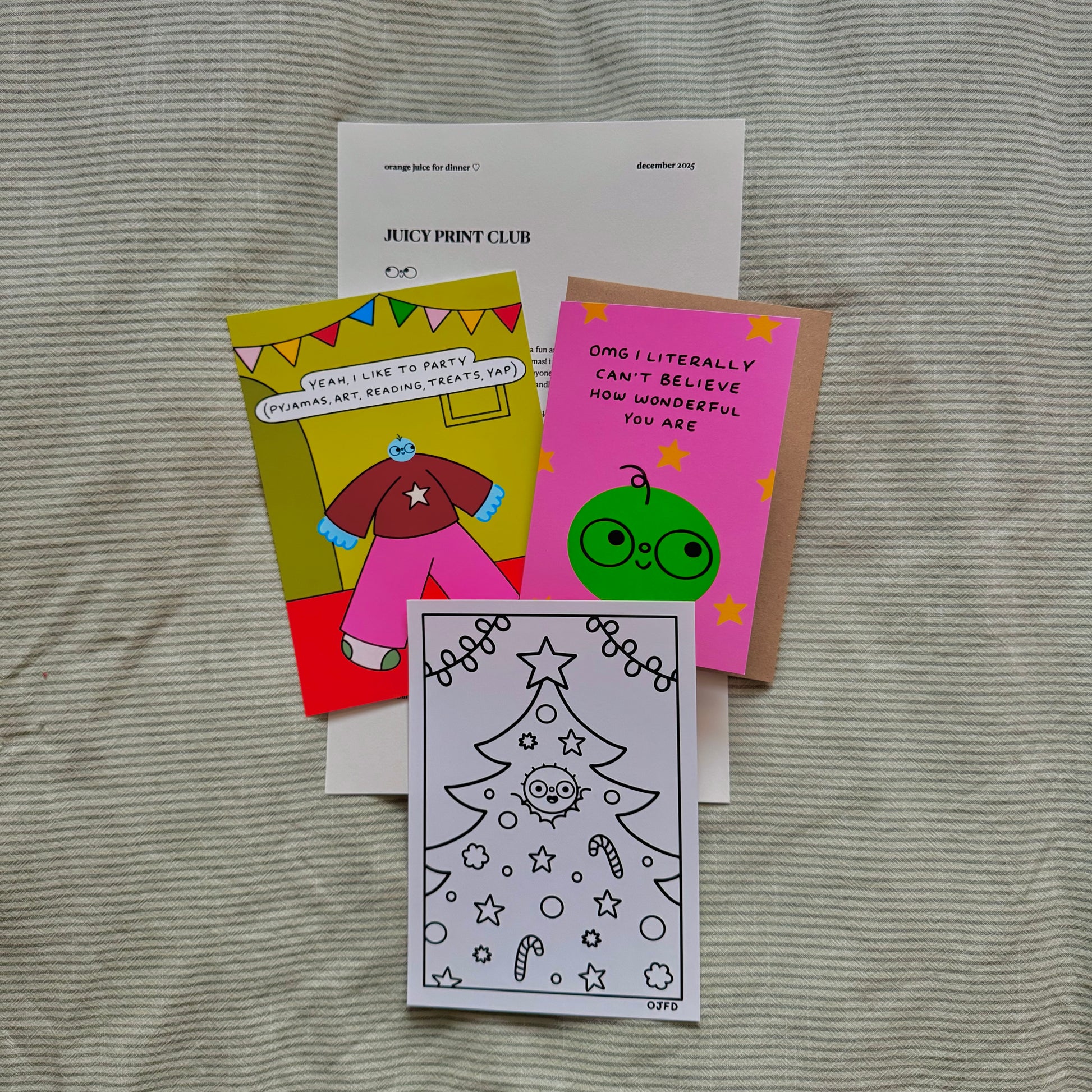 welcome to juicy print club, where i’ll send you a 5x7 exclusive signed print, a letter from me and an extra treat every month! a great way to collect artwork and stickers without having to choose (because i’ll choose for you!) and without breaking the bank!